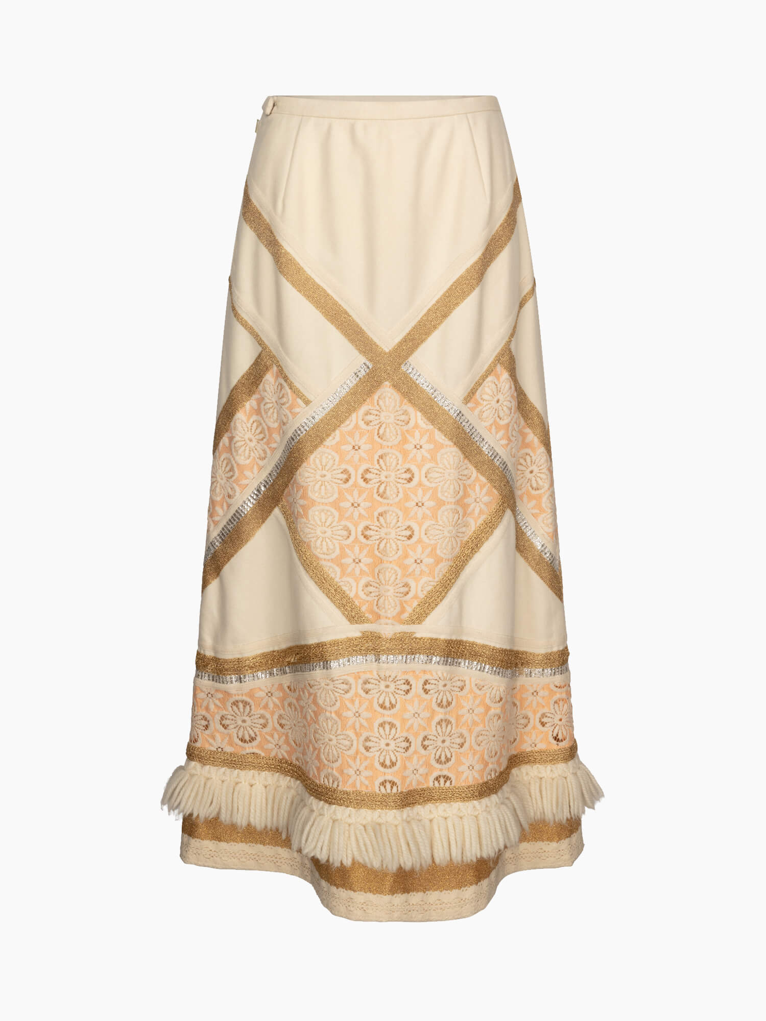 A beautiful maxi skirt from the couture designer Hauser Wodell. With lace and metallic lurex detail, its beautiful pattern brings back the fashion of the 70s.