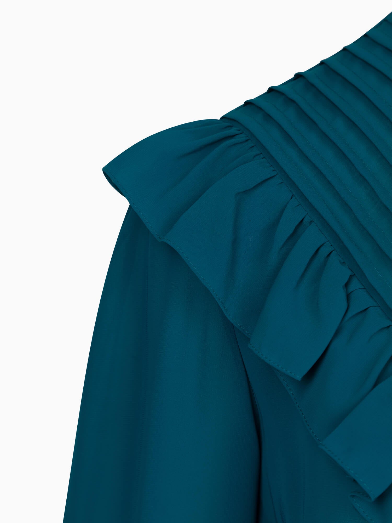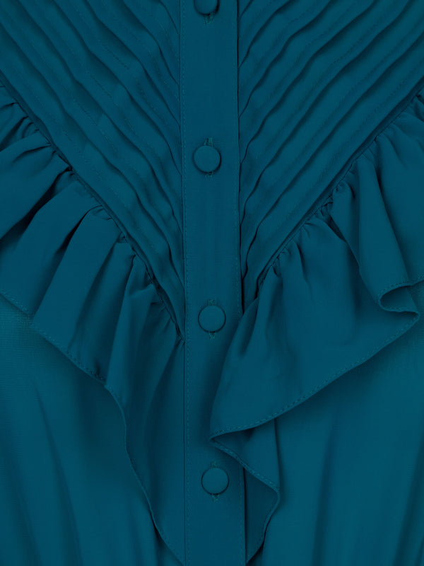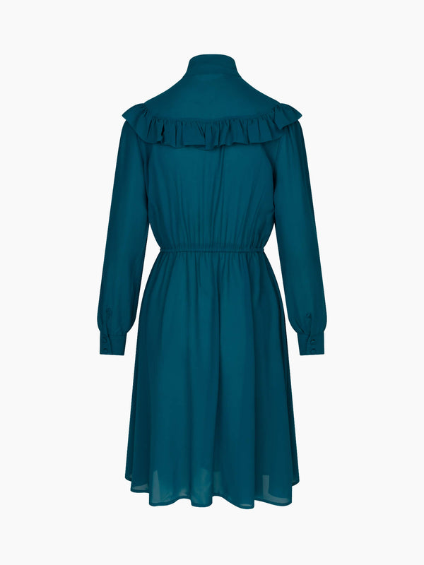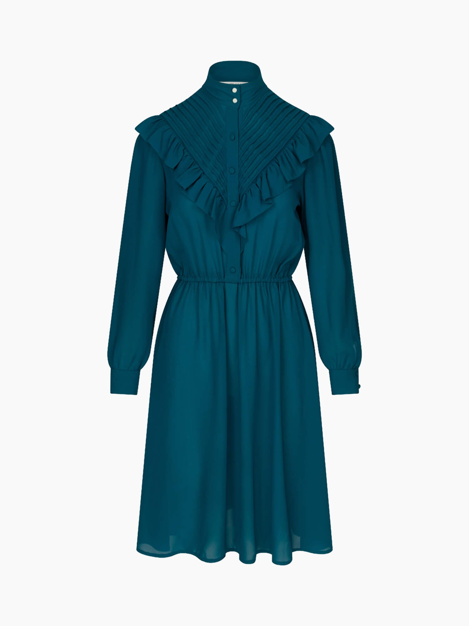 Designed by Mrs. Chaus, this deep blue dress with a high neckline has beautiful details.